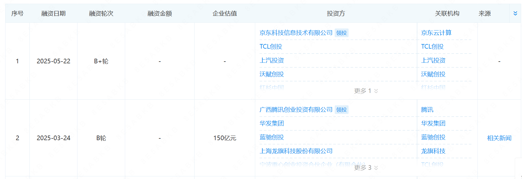 成立至今,智元机器人已完成13轮融资,投资方包括高瓴创投、经纬创投、红杉中国、比亚迪(002594)、腾讯(00700)、京东云计算等。2025年3月融资后,智元机器人估值约150亿元。